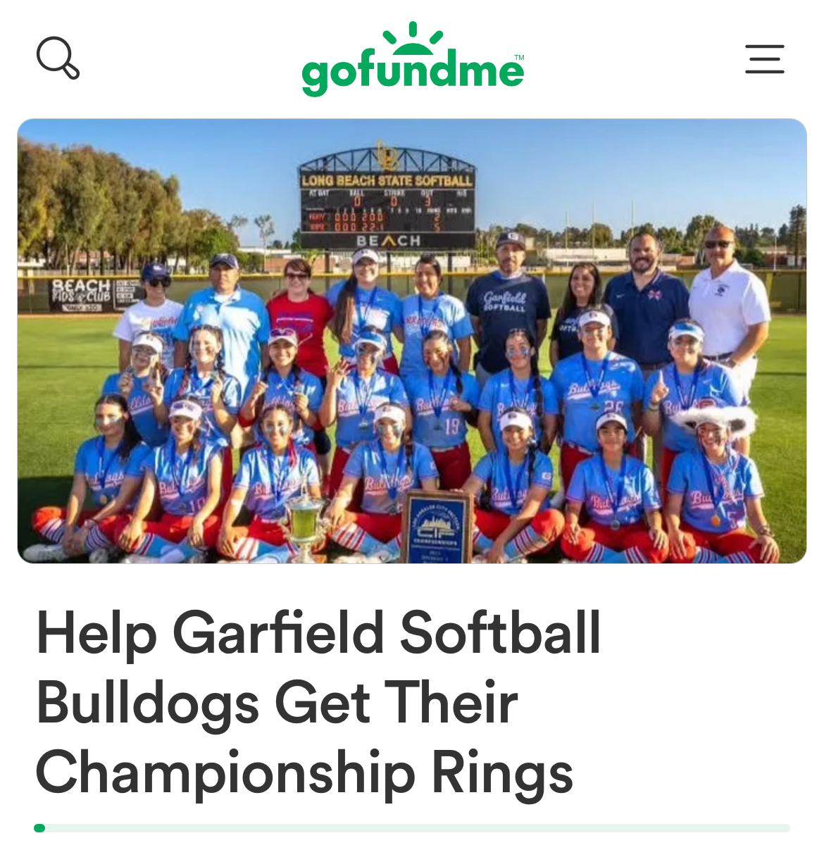 Join us in celebrating the Garfield Bulldogs Varsity Softball team’s incredible achievement. Winning the 2024 CIF SS DIV 1 Softball Championship! We’ve launched this Gofundme campaign to help purchase championship rings for the entire team and staff, ensuring this milestone is forever cherished. Every contribution, regardless of size, will make a meaningful difference in making sure every player receives their ring at no cost. Thank you for standing with and supporting our journey!